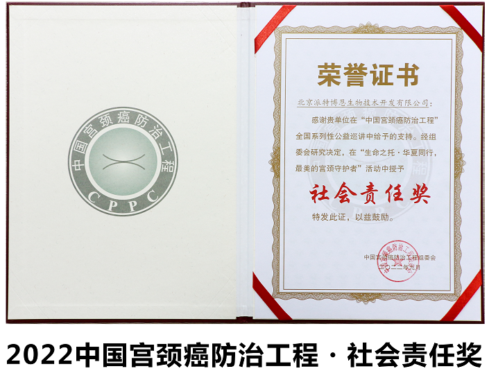 2022年9月,由中國(guó)醫(yī)療保健國(guó)際交流促進(jìn)會(huì)婦產(chǎn)科分會(huì)主辦、山西醫(yī)科大學(xué)第二醫(yī)院協(xié)辦的第十屆中國(guó)宮頸癌防治工程學(xué)術(shù)年會(huì)暨全國(guó)宮頸上皮內(nèi)瘤變及宮頸癌診治熱點(diǎn)論壇順利召開。派特生物再次榮獲中國(guó)宮頸癌防治工程“最美的宮頸守護(hù)者·社會(huì)責(zé)任獎(jiǎng)”。